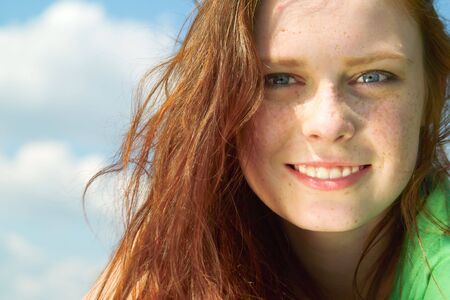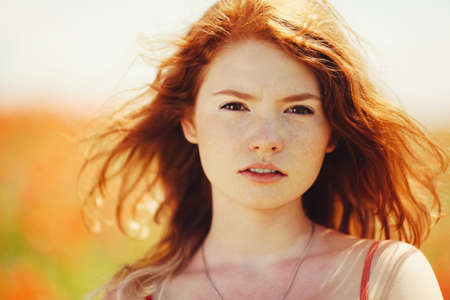 portrait of a girl with freckles on her face. hair that spills in the wind. beautiful and happy.