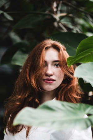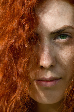 Portrait of young girl with red hair having natural beauty posing at camera with no-makeup