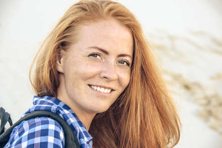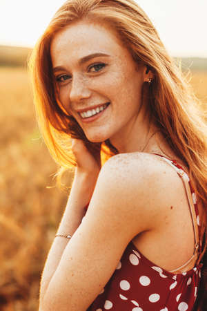 Portrait of pretty young woman with curly copper flowing hair and freckles smiling to camera at bright sunset back light close view