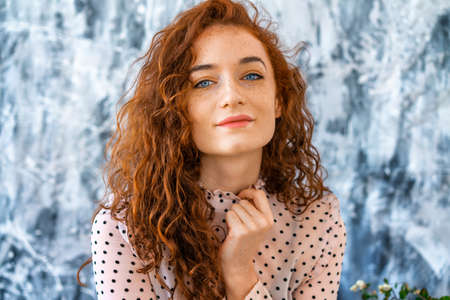 Portrait of red-haired girl on the background of blue wall. Redhead.