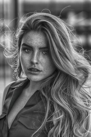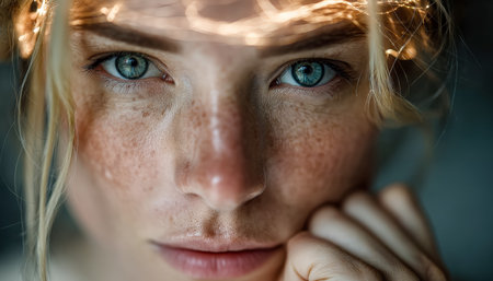 Vibrant portrait highlighting piercing blue eyes, delicate freckles, and radiant skin, capturing raw natural grace and quiet confidence.