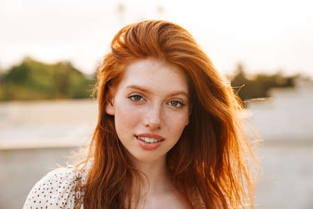 Close up portrait of young gorgeous caucasian ginger girl with freckles outside. Healthy lifestyle, beauty, natural concept.