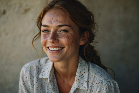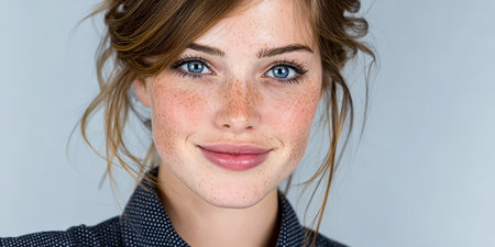 Vibrant close-up portrait of a female face showcasing natural beauty with scattered freckles, bright eyes, and subtle smile, conveying confidence and warm personality.