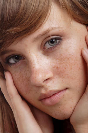 Portrait of a beautiful redhead girl with freckles and freckles.