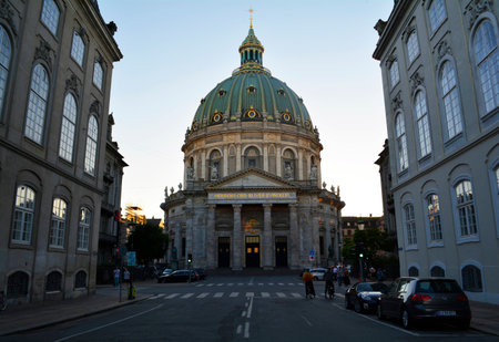 Copenhagen, Denmark - July 2021: Frederik's Church (Frederiks Kirke), also known as The Marble Church (Marmorkirken) at sundown.