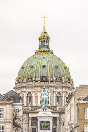 Frederik's Church known as The Marble Church and Amalienborg palace with the statue of King Frederick V in Copenhagen, Denmark