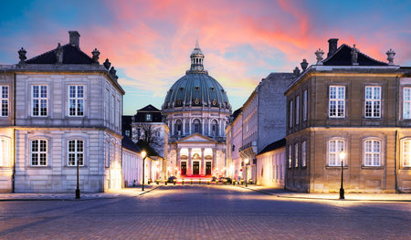 Amalienborg Palace and the Marble Church in Copenhagen, Denmark, after sunset