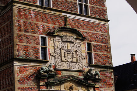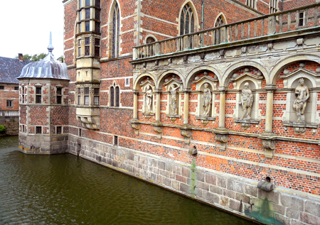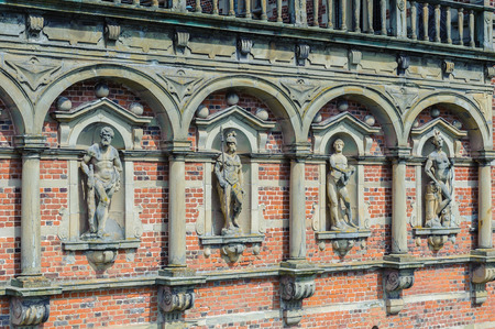 Impressive bricked wall and gorgeous decoration with sculptures at Frederiksborg Castle, Hillerod, Denmark