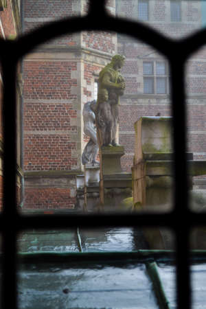 Inner yard of Frederiksborg castle in Copenhagen, Denmark - September, 24th, 2015. Antique copper sculpture and fountain.