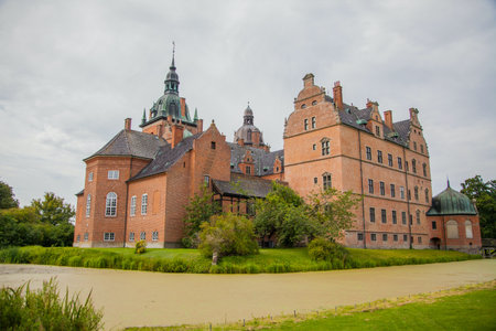 The exterior facade of castle Marsvinsholm with its to towers and the surrounding moat on a warm summer day