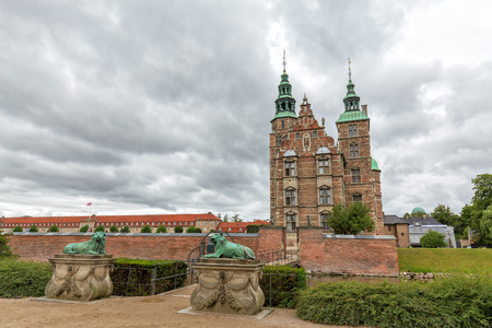 Wide angle view of Rosenborg Castle and Barracks with two lion sculptures in Copenhagen, Denmark.
