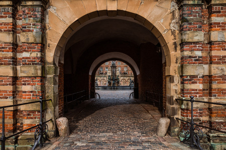 Hillerod, Denmark - September, 24th, 2015. Gateway entrance to Frederiksborg palace near Copenhagen. Arch and red brick wall of the fortress wall of rennessaince castle.