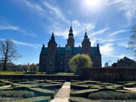 Rosenborg Castle Gardens in Copenhagen, Denmark with blue sky