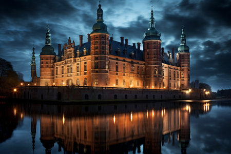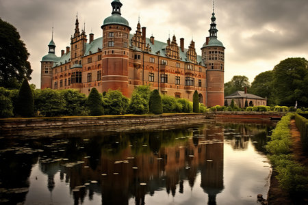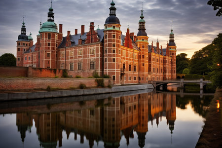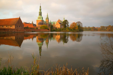 View of Frederiksborg castle on a cloudy November evening, Hillered, Denmark