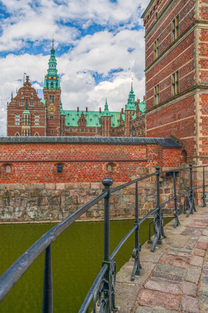 Entrance to Frederiksborg castle in Copenhagen, Denmark - September, 24th, 2015. Red brick fortress wall and green copper spiels of towers of renaissance castle Frederiksborg.