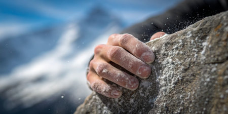 A climber grips a rough stone as dust flies from the pressure of their hold.