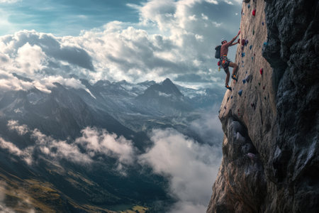 A climber ascends a steep rock wall surrounded by stunning mountains and clouds during daylight.