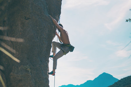 A rock climber climbs a rock against the background of mountains and sky, a man trains strength and endurance, overcoming the fear of heights, training in nature.