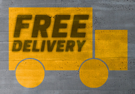 deliveryman showing carton box with Free Delivery label, yellow studio