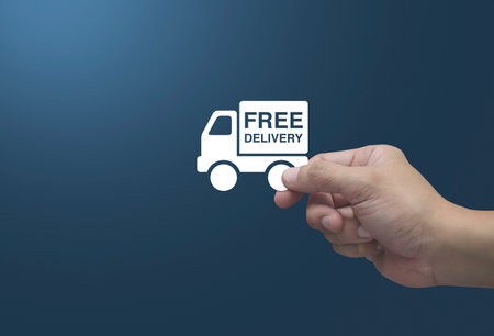 Hand holding free delivery truck flat icon in fingers over light blue background, Business transportation service concept