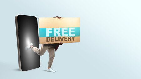 People come out from the mobile phone screen carrying large packets for delivery with free delivery text on a colored background. Delivery service concept