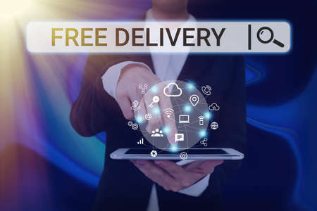Inspiration showing sign Free Delivery. Word Written on Shipping Package Cargo Courier Distribution Center Fragile Lady Pressing Screen Of Mobile Phone Showing The Futuristic Technology