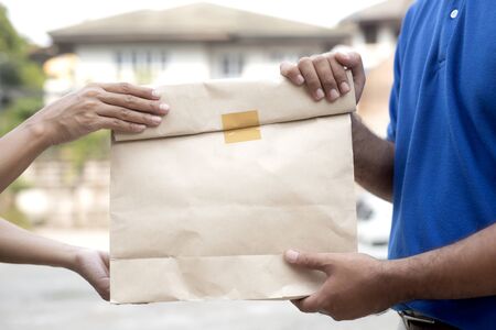 Woman hand accepting a delivery of paper containers for takeaway food from deliveryman,Delivery concept.