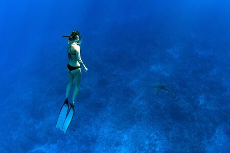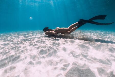 Attractive woman free diver glides with fins over sandy sea. Freediving in a tropical ocean
