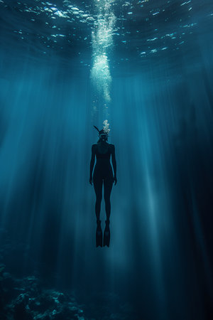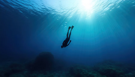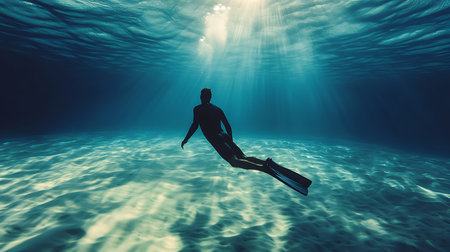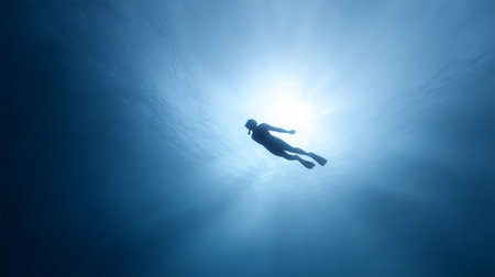 Silhouette of scuba diver swimming in the deep blue ocean with sun rays shining through the water surface, creating a tranquil and serene atmosphere