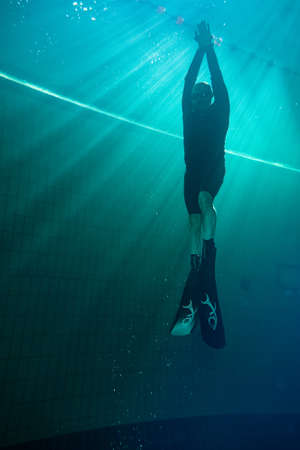 Freediver dives in a deep pool in the sunshine. A diver in flippers, glasses, a wetsuit emerges from the depths of the pool. The man is engaged in active water sports. Healthy lifestyle
