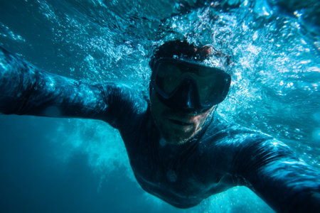 Male free diver taking a selfie while diving into the blue.