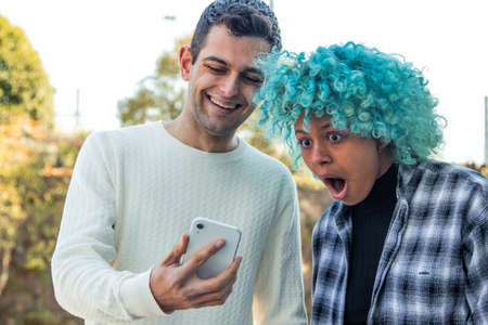 Generative AI : Selfieportrait of funny couple in summer park Friends having fun laughing together People and technology concept