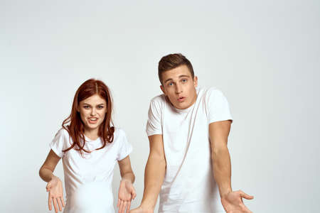 a pregnant woman and a young man are waiting for a baby on a light background emotions family love