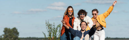 A group of joyful friends smiling and laughing under a bright blue sky, with playful bunny ears and casual outfits adding fun vibes.