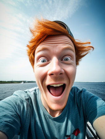 Generative AI : Happy tourist caucasian man having fun taking a selfie at New York city
