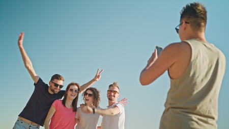 Young people posing for a photo on the beach. Medium shot. Soft Focus.