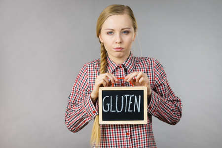 Disgusted young woman with braided hair holding small black board with gluten sign and bun bread roll. Bakery and bread allergy problem.