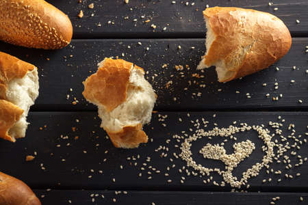 French baguettes in paper bags on black wooden background, heart drawn on sesame seeds