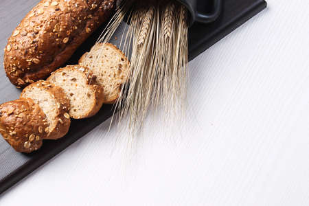 Fresh baked bread with ears of wheat. Wheat yellow. Breakfast is