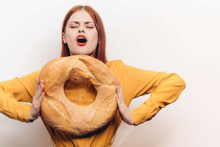 a young woman holds a round loaf in her hands on a light background in a yellow shirt