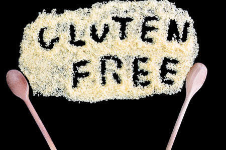 Metal spoons of various gluten free flour almond flour, oatmeal flour, buckwheat flour, rice flour, corn flour and gluten free lettering made of wooden letters, flat lay, top view