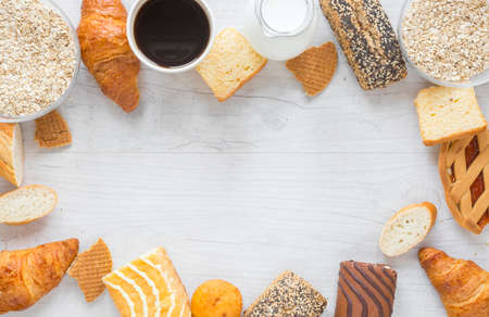 Food composition of breads products, close up top view. Quality sort of wholegrain bread and cookies, free space. Healthy morning snack concept