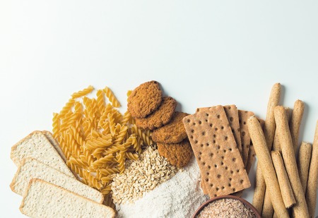 Containing gluten food on light background. Main body's main fuel carbohydrates. Top view, flat lay, copy space