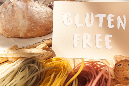 gluten free breads, glutenfree word written and bread rolls on grey background