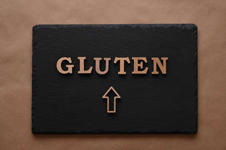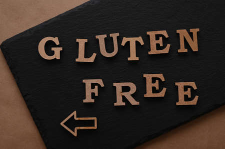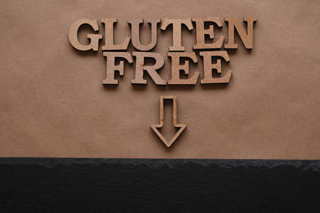 Gluten free food, healthy eating concept. Gluten-free text, white letters on rustic wooden cubes, wood board background, top view. 3d illustration