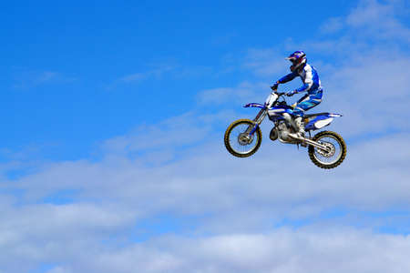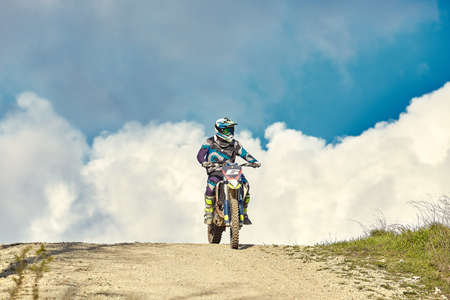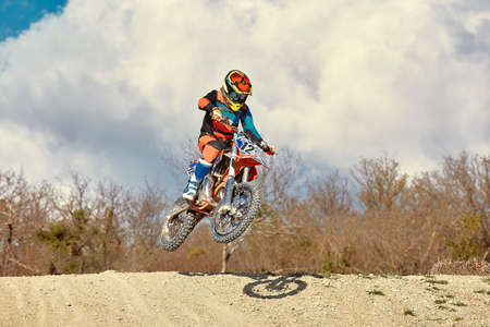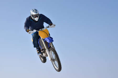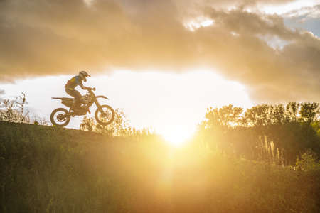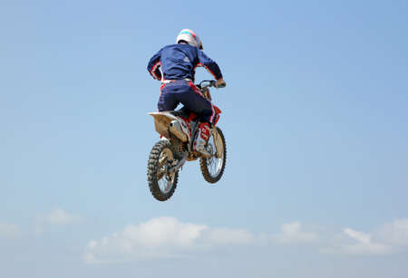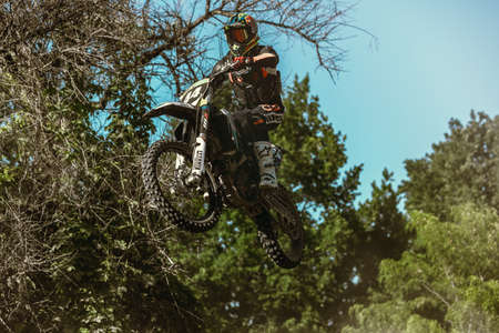 Racer on motorcycle dirtbike motocross cross-country in flight, jumps and takes off on springboard against sky. Concept active extreme rest