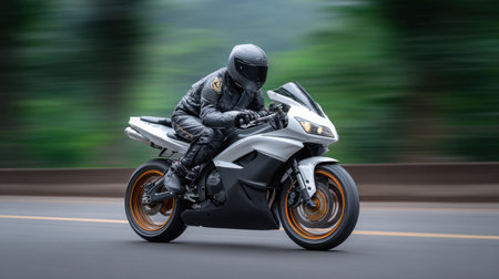 A thrilling dynamic shot of a motorcycle rider speeding along a scenic road. The blurred background creates a sense of motion, emphasizing adventure, freedom, and excitement in a stunning outdoor setting.