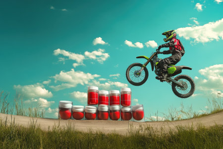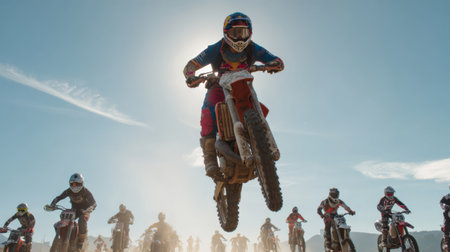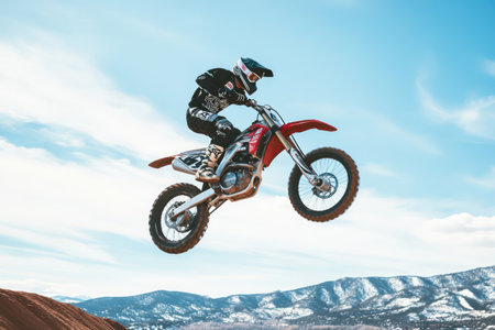 Dynamic action shot of a dirt bike rider soaring over a jump, capturing adrenaline, excitement, and adventurous spirit in sport.