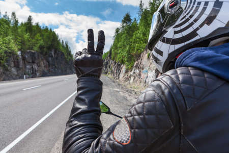 Close-up rear view of motorcyclist showing victory sign with hand in leather glove