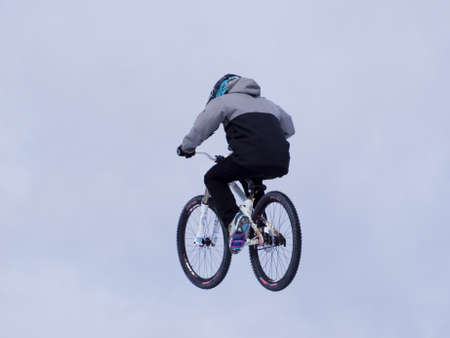 Extreme cyclists, young man doing jump with bmx bike on background of black and white silhouette and clouds